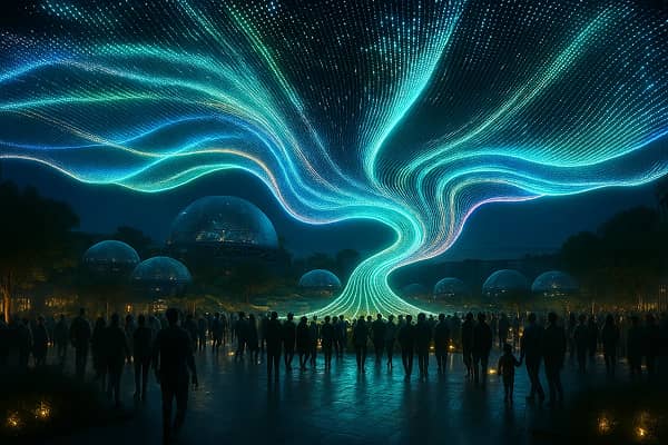 AG的未来城市模型基于系统思维,将能源、交通、水资源与食物供应整合为一个互联的生态体。 在这里,每个城市节点都在实时学习、计算与自我优化。 这是一个真正会呼吸、会进化的城市。